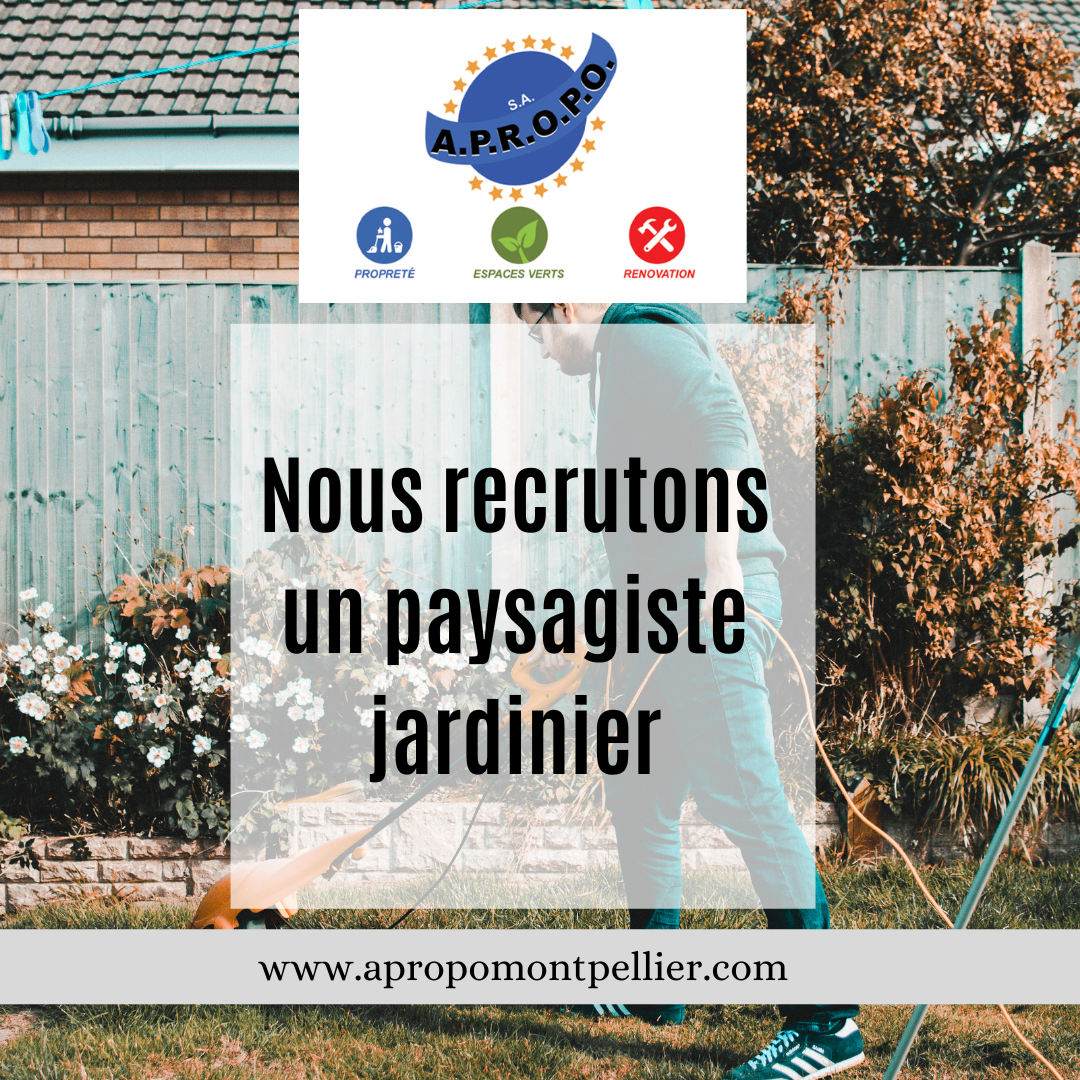 Vous avez une formation et de l'expérience de paysagiste ? Vous souhaitez intégrer une société dynamique et en croissance ? Rejoignez nos équipes ! APROPO recrute un(e) paysagiste en CDI à temps plein (35H/semaine) pour intervenir à MONTPELLIER. Vous aurez comme mission d'assurer l'entretien de résidences et copropriétés à Montpellier et ses alentours : Création, aménagement, plantation, arrosage, élagage etc. Disposer d'une formation de jardinier e et du permis de conduire est obligatoire pour ce poste. Nous attendons comme compétences : sérieux, autonomie et la capacité d'adaptation. APROPO est une entreprise humaine, engagée et responsable pour des prestations d'entretien de qualité au service des professionnels et des usagers. Telle est notre raison d'être depuis près de 40 ans. APROPO a toujours accordé une place importante aux valeurs humaines dans ses relations professionnelles en adaptant sa politique des ressources humaines aux besoins et aux attentes de ses collaborateurs et collaboratrices. Que vous bénéficiez d'une RQTH ou que vous soyez éloigné(e) de l'emploi, nous vous accompagnons. Et bénéficiez de la sécurité de l'emploi, de notre Comité d'entreprise avec ses nombreux avantages, de notre mutuelle, de formations adaptées en intégrant notre entreprise. Conscient de notre responsabilité sociale, sociétale et environnementale, APROPO s'engage et mène une politique active sur les 3 volets de la RSE : économique, social et environnemental. Faites-nous parvenir votre CV à apropomontpellier@gmail.com .